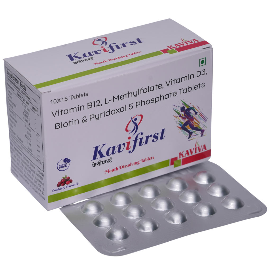 Kavifitst Tablet is a mouth-dissolving, sugar-free nutritional supplement formulated for the management of Vitamin B12 deficiency and related neurological and metabolic conditions. It contains a synergistic combination of Methylcobalamin (1500 mcg), L-Methyl Folate, Pyridoxine-5-Phosphate, Biotin, and Vitamin D3, all in highly bioavailable forms. The tablet dissolves easily in the mouth, ensuring convenient intake and better compliance.