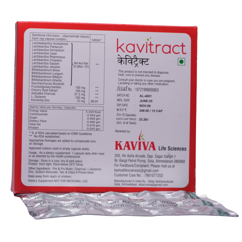 Kavitract Capsules are an advanced pre- and probiotic formulation designed to support digestive health, gut balance, and overall gastrointestinal wellness. The formulation contains a powerful blend of 13 prebiotics and probiotics, with each probiotic strain providing not less than 25 billion CFU, along with activated charcoal, all delivered in 100% vegetarian capsules.