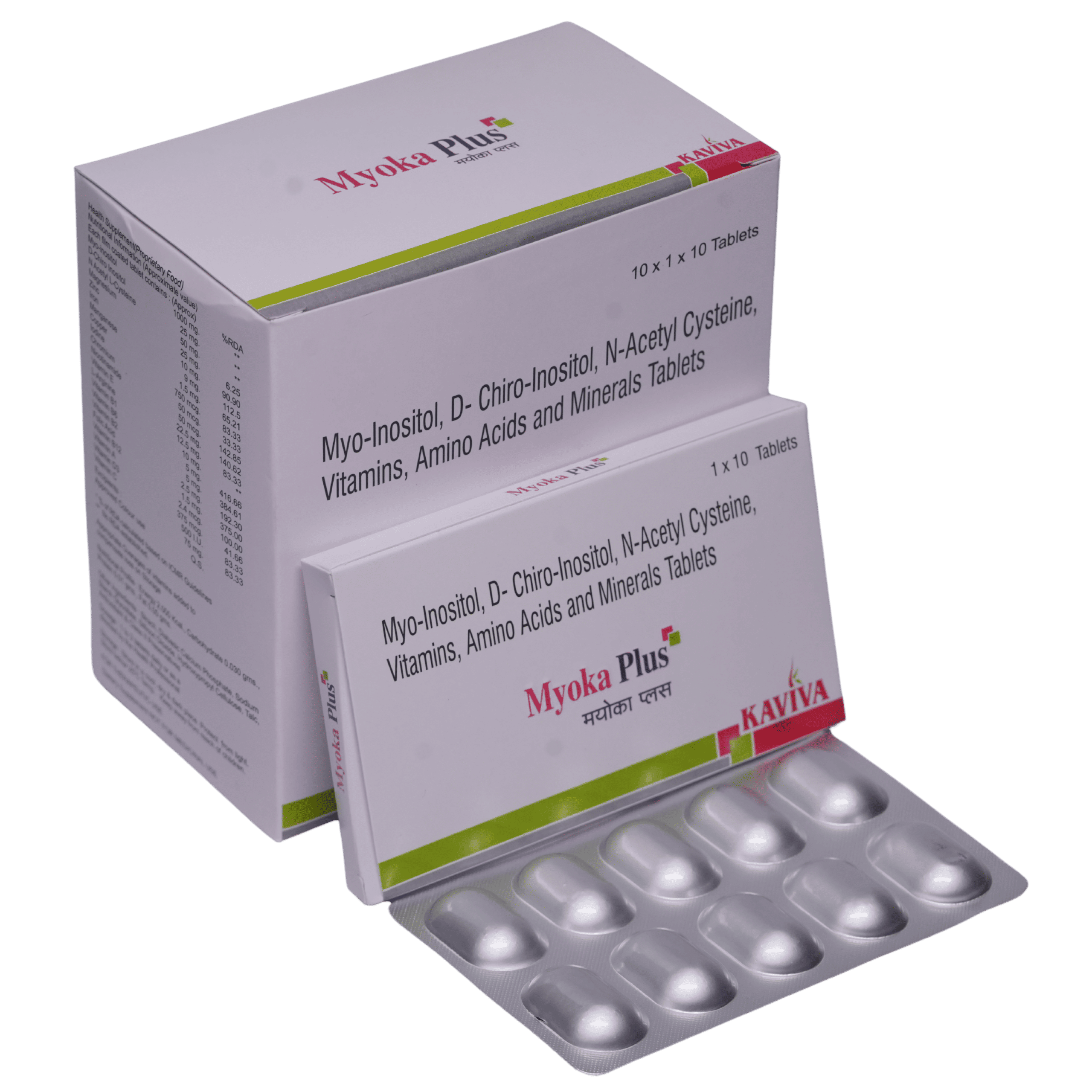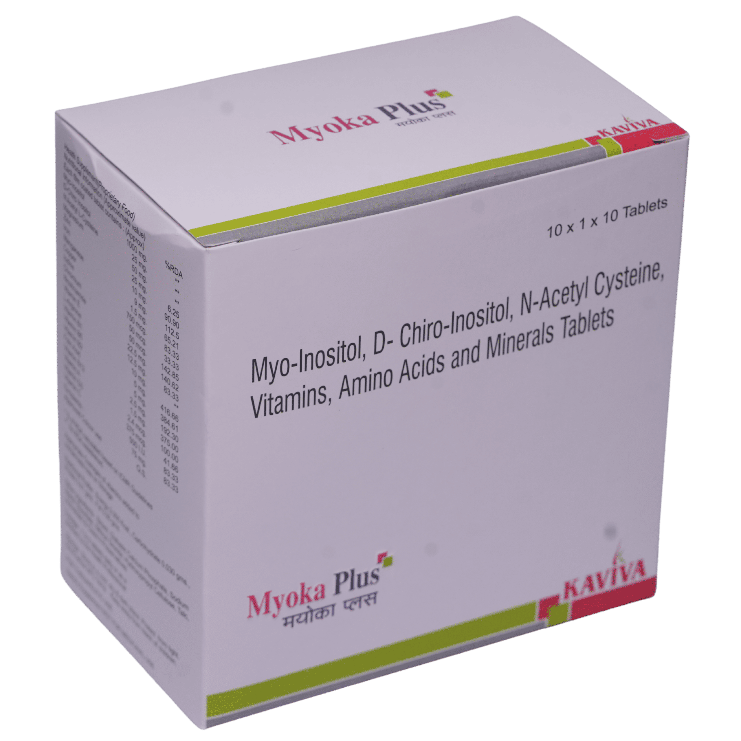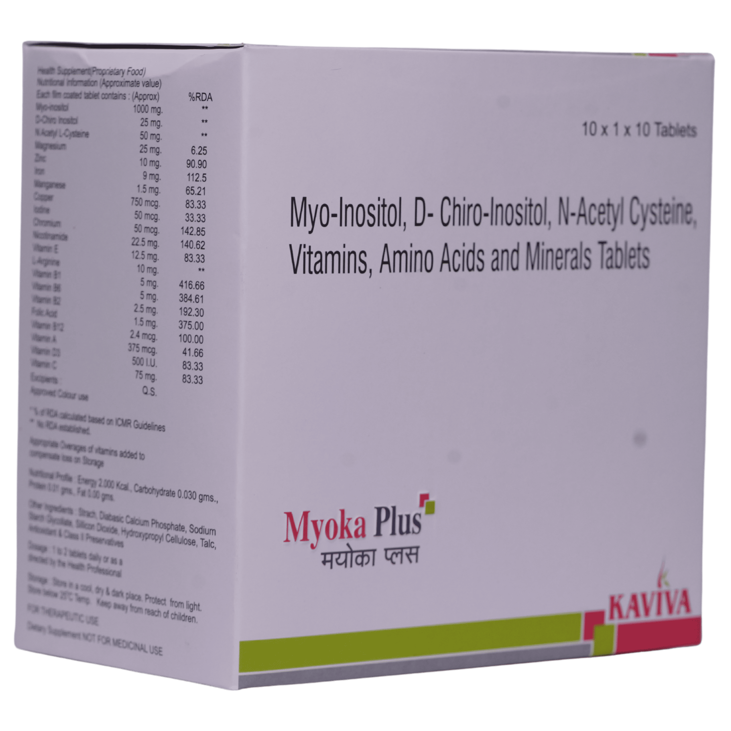Myo-inositol 1000mg, D-Chiro inositol 25mg, N Acetyl L Cystein 50mg, Magnesium 25mg, Zinc 10mg, Iron 9mg, Mangenese 1.5mg, Copper 750mg, Selenium 100mcg, Iodine 50mcg, Chromium 50mcg, Nicotinamide 22.5mg, PABA 12.5mg, Vitamin E 12.5mg, L-Arginine 10mg, Vitamin B1 Nitrate 5 mg, Vitamin B6 5mg, Vitamin B2 2.5mg, Folic Acid 1.5mg, Vitamin B12 500mcg, Vitamin A 375mcg, Vitamin D3 500IU, Vitamin C 75mg Tablet